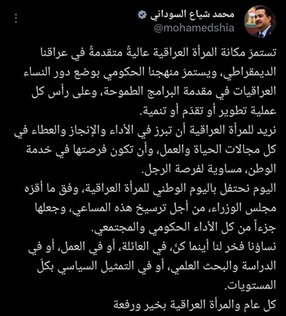 وأردف القول: "نساؤنا فخر لنا أينما كنّ، في العائلة، أو في العمل، أو في الدراسة والبحث العلمي، أو في التمثيل السياسي بكلّ المستويات، كل عام والمرأة العراقية بخير ورفعة".