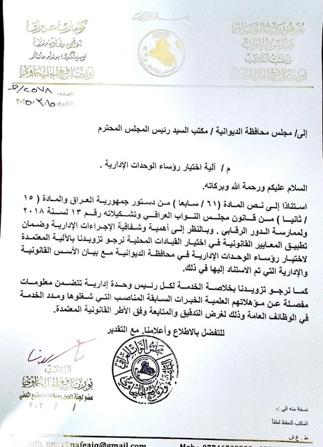 ووجهت اسئلة من خلال كتاب رسمي لمجلس محافظة الديوانية تطالب بتزويدها بالآلية التي تم إعتمادها من قبل المجلس في إختيار رؤساء الوحدات الإدارية والأسس القانونية والإدارية التي تم الإستناد إليها في هذا الإختيار مع تزويدها بخلاصة خدمة ومعلومات مفصلة لكل رئيس وحدة إدارية لغرض تدقيقها وفق الاطر القانونية".