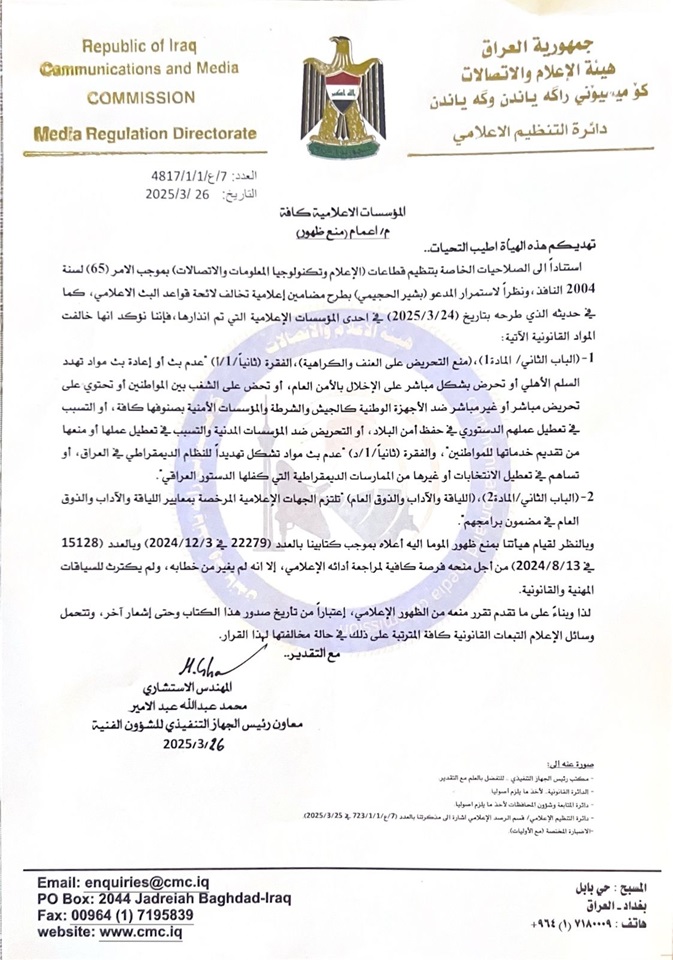 قررت هيئة الإعلام والاتصالات، منع ظهور المحلل السياسي (بشير الحجيمي) في وسائل الإعلام إلى إشعار آخر.