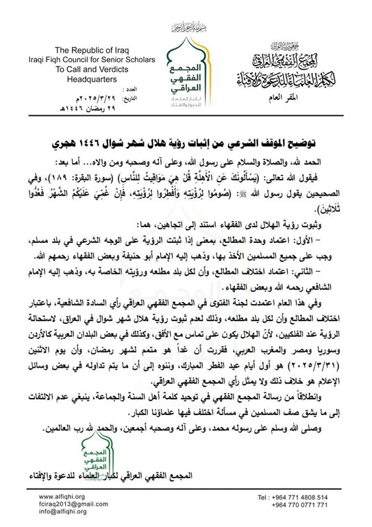 وأشار البيان إلى أن الحسابات الفلكية بينت استحالة رؤية الهلال في العراق وبعض الدول المجاورة كإيران وسوريا ومصر والمغرب، وهو ما عزز قرار اعتماد الأحد متممًا لشهر رمضان.