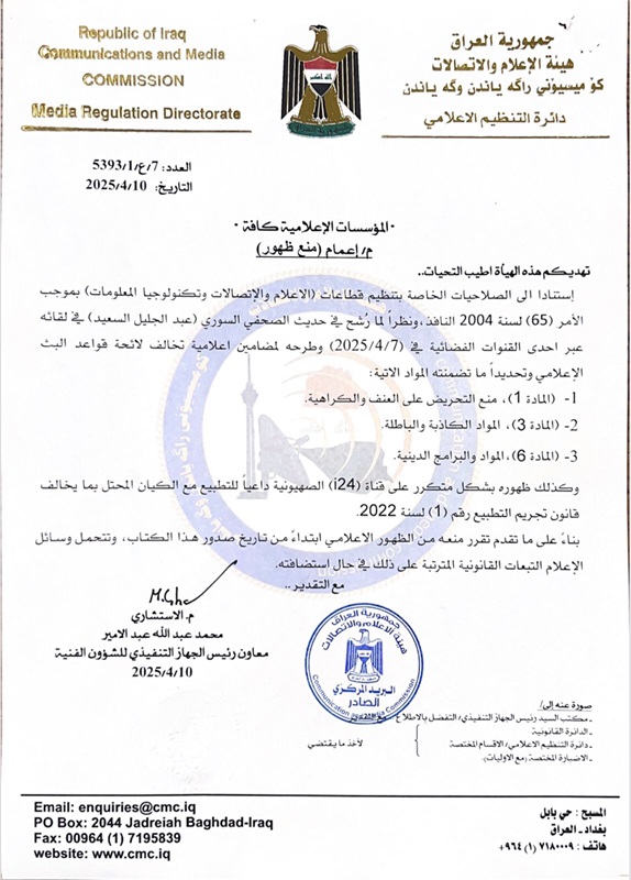 وعزت وثيقة صادرة عن الهيئة ذلك الى طرحه مضامين اعلامية تخالف لائحة قواعد البث الاعلامي وظهوره المتكرر على قناة صهيونية.