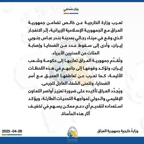 وذكر بيان لوزارة الخارجية أن "وزارة الخارجية تعرب عن خالص تضامن العراق مع الجمهورية الإسلامية الإيرانية، إثر الانفجار الذي وقع في ميناء رجائي بمدينة بندر عباس جنوبي إيران، وأدى إلى سقوط عدد من الضحايا وإصابة المئات من المدنيين الأبرياء".