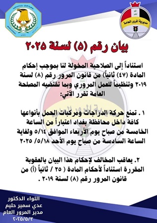 أعلنت مديرية المرور العامة، اليوم السبت ، عن منع حركة الدراجات النارية ومركبات الحمل بمختلف أنواعها في بغداد، وذلك ابتداءً من يوم 14 أيار ولغاية 18 من الشهر ذاته.