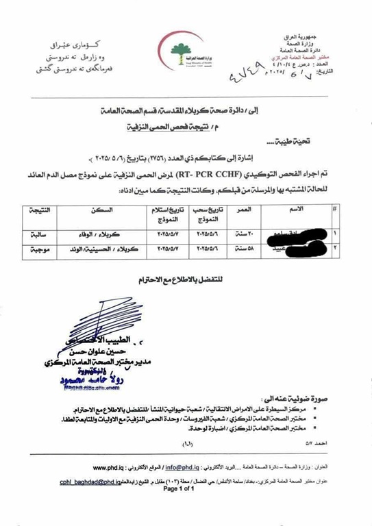 وجاء في وثيقة للوزارة، انه "تم تسجيل اصابة ثانية بالحمى النزفية في منطقة الوند التابعة لقضاء الحسينية في كربلاء". وأضاف ان "الإصابة الأولى في منطقة الجدول الغربي والتي أدت الى وفاة المصاب".