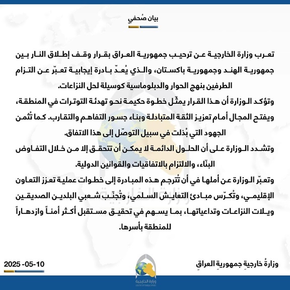 اعربت وزارة الخارجية عن ترحيب جمهورية العراق بقرار وقف إطلاق النار بين جمهورية الهند وجمهورية باكستان، والذي يُعدّ بادرة إيجابية تعبر عن التزام الطرفين بنهج الحوار والدبلوماسية كوسيلة لحل النزاعات.