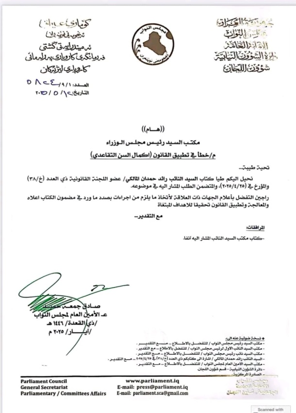 رئاسة مجلس النواب تخاطب مكتب السيد رئيس الوزراء بشأن التطبيق الصحيح لقانون التقاعد ومعالجة الخطأ الذي يحصل في احتساب السن التقاعدي واعتماد اكمال السن التقاعدي وليس مجرد بلوغه.
