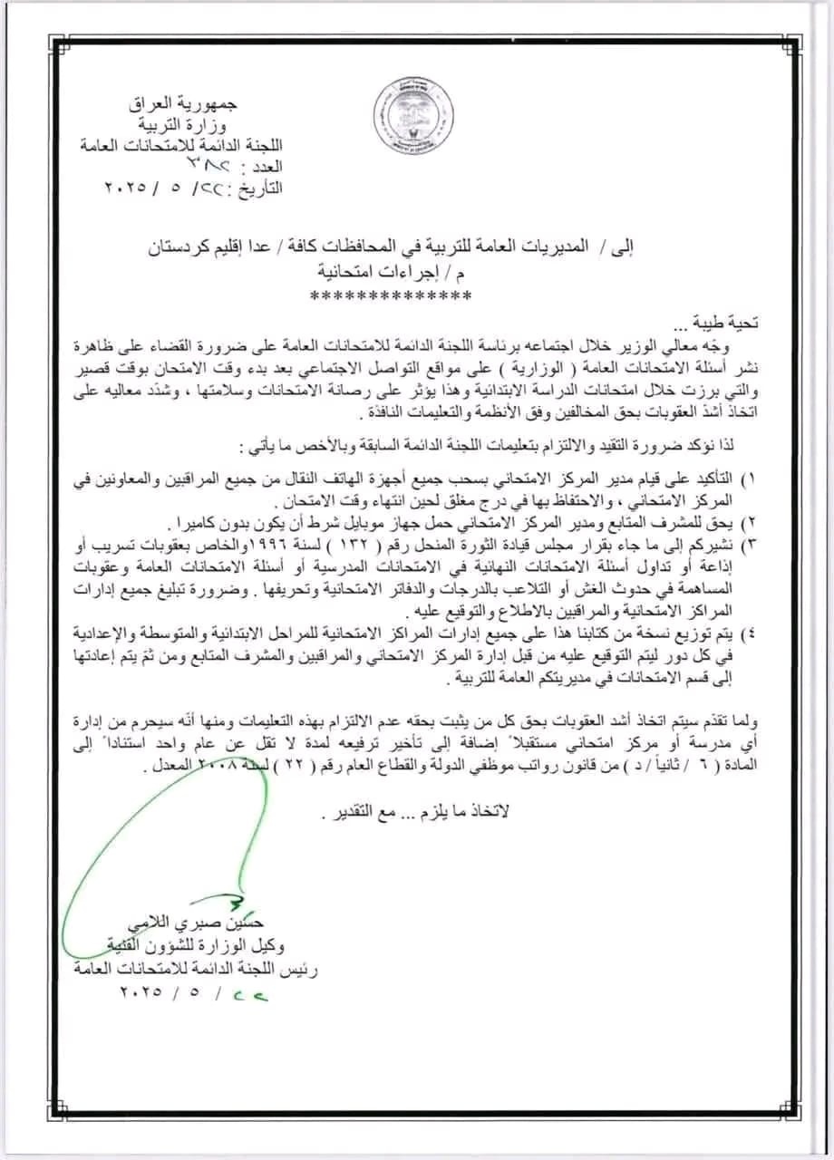 وذكر كتاب صادر عن المديرية، أنه بناءً على اجتماع ترأسه وزير التربية، تم التأكيد على ضرورة القضاء على ظاهرة نشر أسئلة الامتحانات، مع التوعد بـ"عقوبات مشددة" للمخالفين.