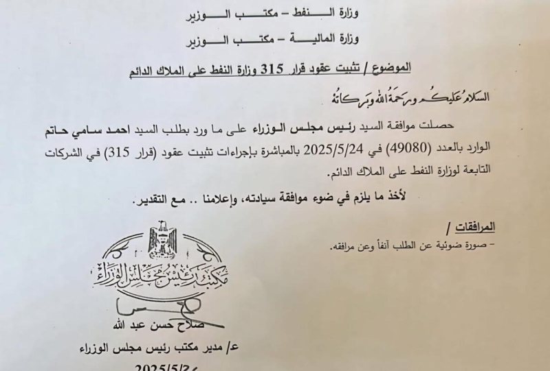 وتشير الوثيقة الصادرة عن مكتب رئيس مجلس الوزراء، إلى أن هذه الخطوة تهدف إلى تثبيت عقود العاملين في شركات النفط، وذلك لأخذ ما يلزم في ضوء موافقة رئيس مجلس الوزراء.