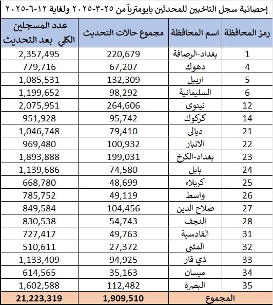 المفوضية ذكرت في بيان أن "عدد المسجلين بايومترياً بلغ 21.223.319 ناخبا"، مضيفة أن "مجموع حالات تحديث البيانات بلغ 1.909.510".