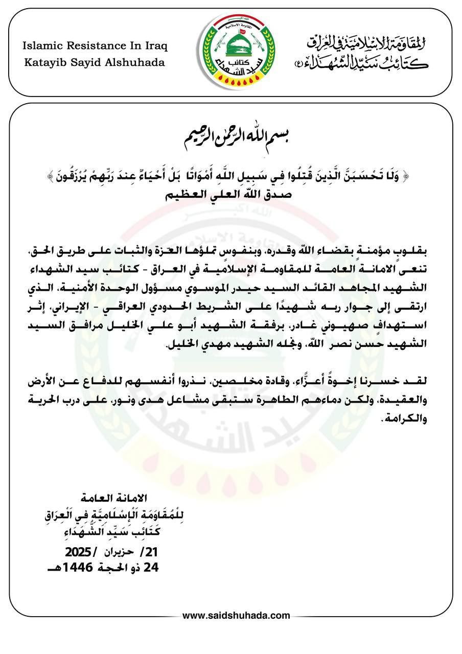كتائب سيد الشهداء تنعى القيادي الشهيد السيد حيدر الموسوي