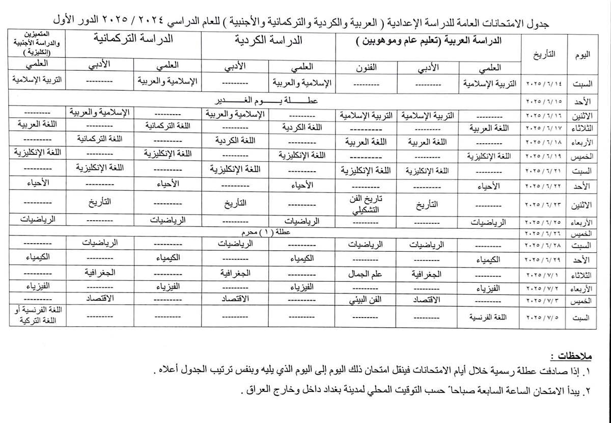 وذكر بيان للوزارة إن "وزارة التربية تنشر الجدول الجديد للامتحانات العامة لطلبة السادس الاعدادي (الدور الاول) / للعام الدراسي (2024-2025) بعد تضمينه عطلة راس السنة الهجرية"