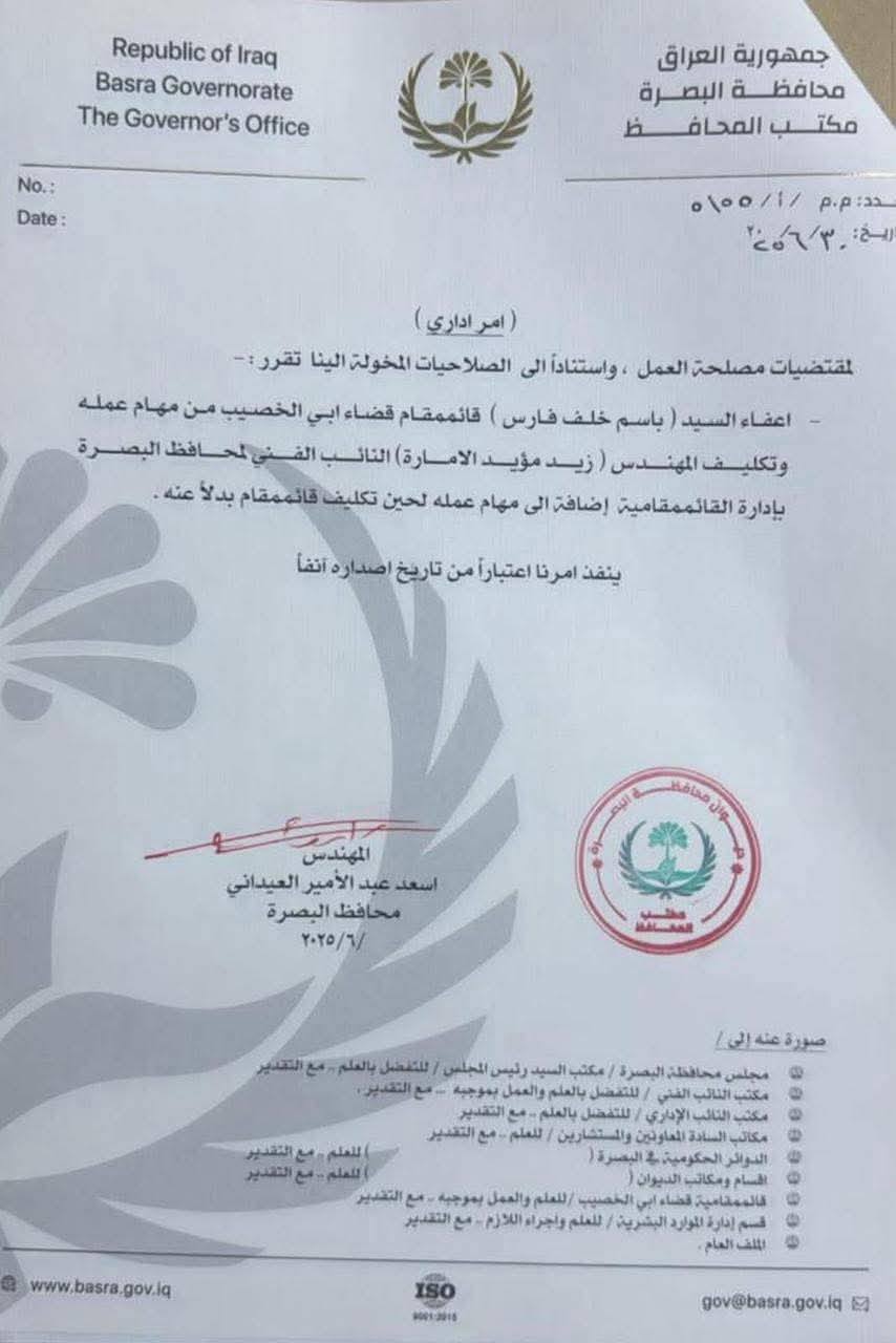 محافظ البصرة يقيل قائممقام قضاء أبي الخصيب ويكلف معاونه الفني بديلاً عنه.