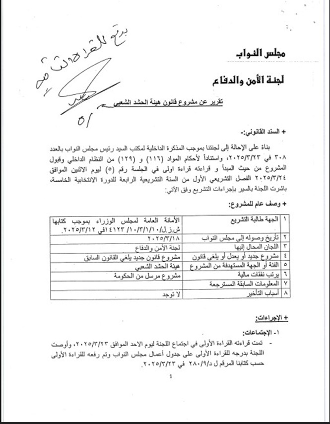 وقرأ مجلس النواب، في جلسته المنعقدة اليوم تقرير ومناقشة مشروع قانون هيئة الحشد.