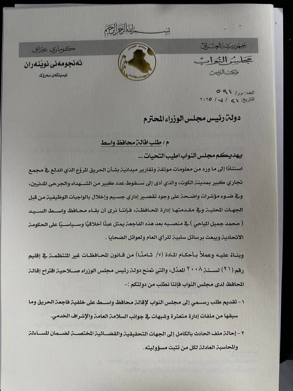 رئيس مجلس النواب يخاطب رئيس الوزراء من أجل تقديم طلب رسمي لإقالة محافظ واسط لتقصيره في الفاجعة الأليمة التي ألمّت بأهالي الكوت