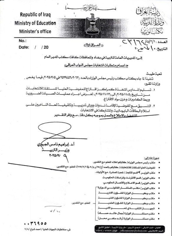 وبحسب الوثيقة ادناه فأن وزارة التربية ستعطل الدوام المدرسي وتسلم المدارس للمفوضية العليا المستقلة للانتخابات من تاريخ 2025/11/5 إلى 2025/11/13: