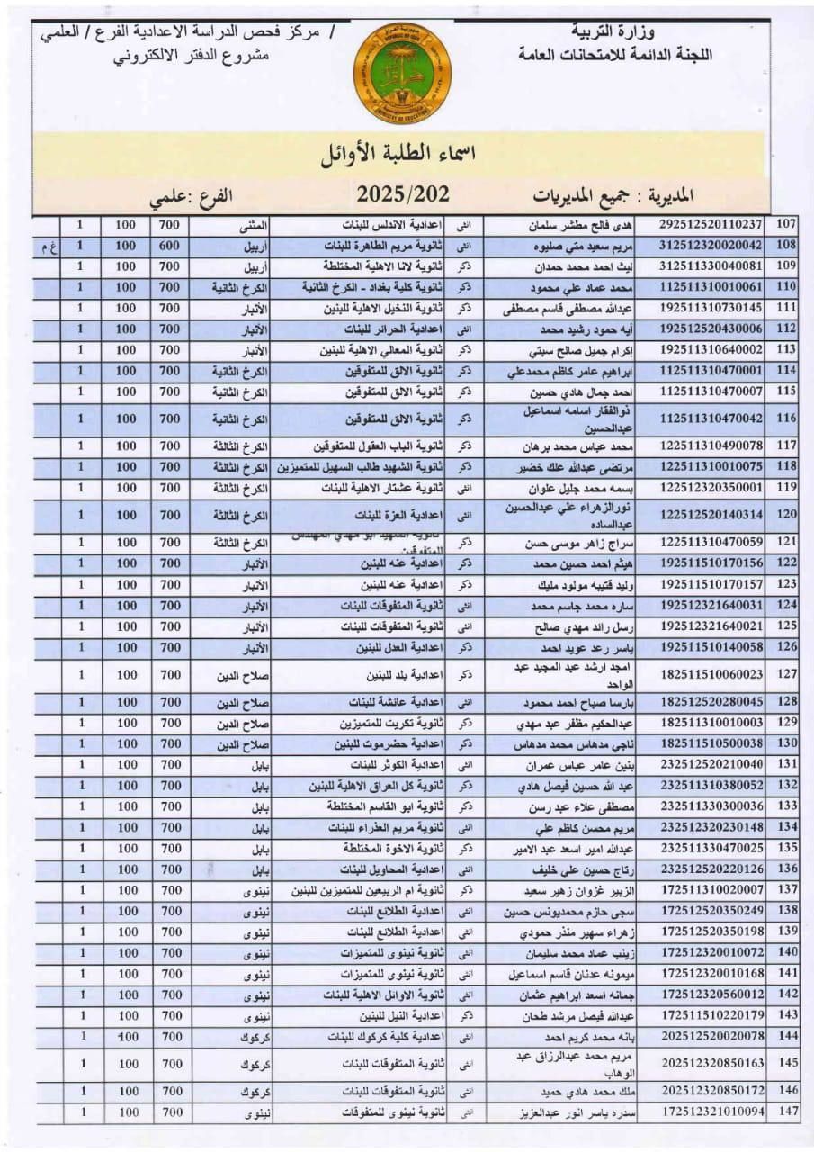 وبحسب القوائم فأن وزارة التربية نشرت 171 اسم طالب في الفرع العلمي ولجميع مديرياتها.