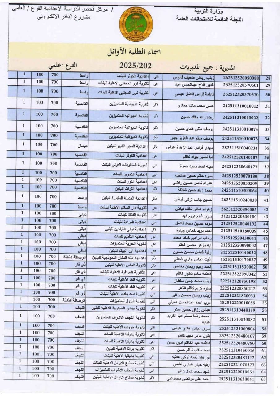 أعلنت وزارة التربية، اليوم السبت (26 تموز 2025)، عن أسماء الطلبة الأوائل على العراق للفرع العلمي.