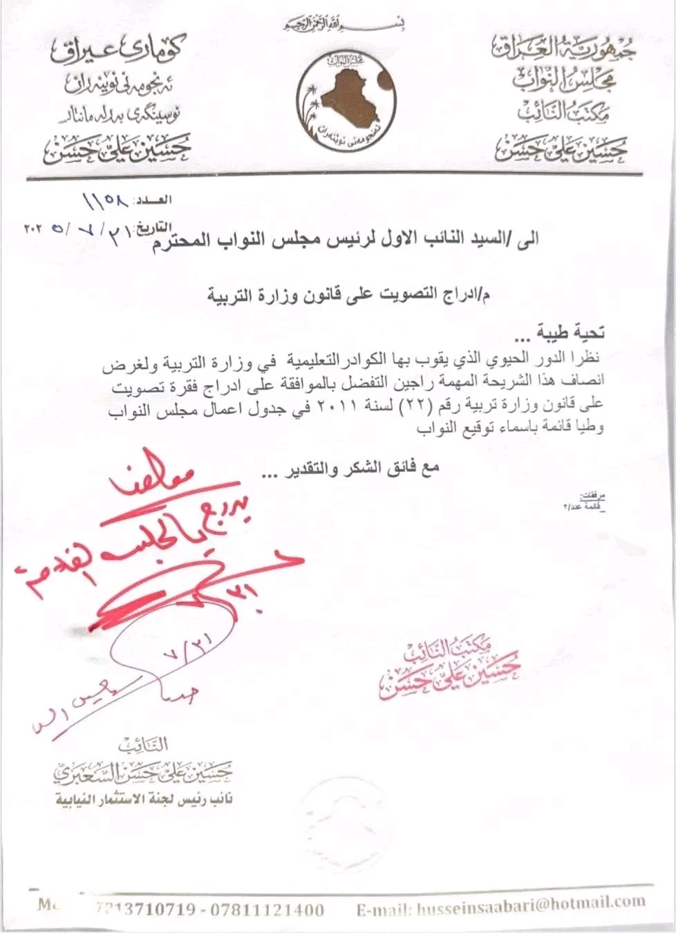 طالب النائب حسين علي، اليوم الخميس، (31 تموز 2025)، رئاسة مجلس النواب، بإدراج قانون وزارة التربية في الجلسة القادمة للتصويت عليه.