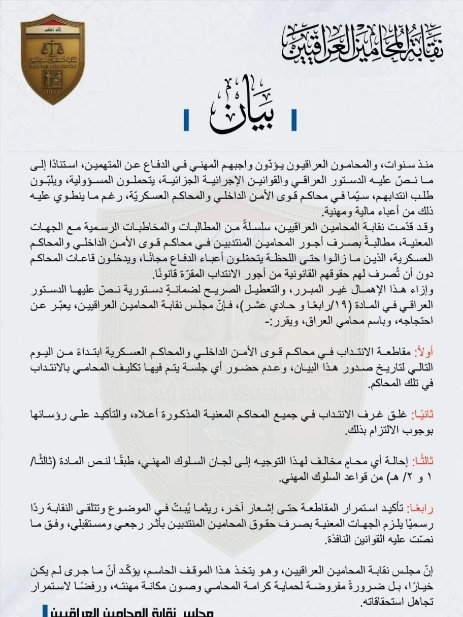 أعلن مجلس نقابة المحامين العراقيين، عن مقاطعة الانتداب أمام المحاكم العسكرية ومحاكم قوى الأمن الداخلي احتجاجًا على عدم صرف أتعاب المحامي المنتدب وتعطيل حقوقه القانونية.