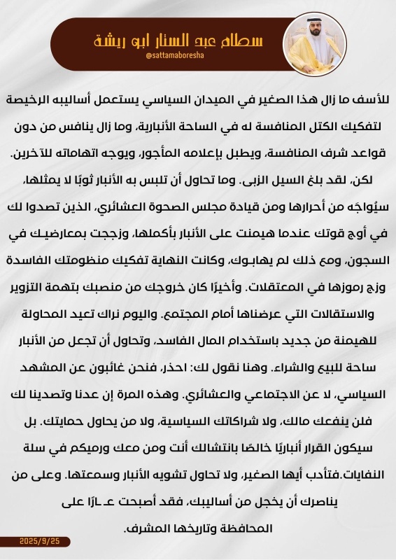 شن السياسي سطام عبد الستار أبو ريشة، اليوم الخميس (25 أيلول 2025)، هجوماً عنيفاً على خصومه السياسيين في الأنبار، في اشارة الى رئيس تحالف تقدم محمد الحلبوسي، متهماً إياهم باستخدام "أساليب رخيصة" و"ممارسات فاسدة" لتفكيك الكتل المنافسة والإساءة إلى المحافظة.