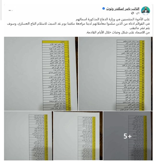 ونشر وتوت في منشور على حسابه بفيسبوك قوائم ضمت اكثر من 300 منتسب في الوزارة، معلقا عليها: "على الأخوة المنتسبين في وزارة الدفاع المذكورة اسمائهم في القوائم ادناه من الذين سلموا معاملاتهم لدينا مراجعة مكتبنا يوم غد السبت لاستلام الباج العسكري، وسوف يتم نشر ماتبقى من الاسماء على شكل وجبات خلال الأيام القادمة".
