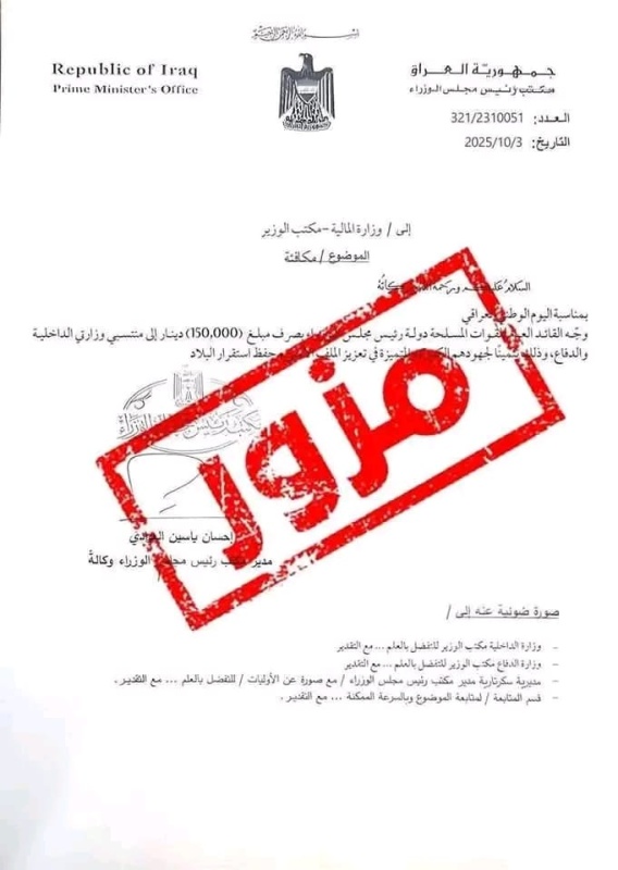 نفت رئاسة الوزراء ، اليوم الاثنين (6 تشرين الأول 2025)، صحة ما تداولته بعض الصفحات على مواقع التواصل الاجتماعي حول صرف مبلغ (150,000) دينار لمنتسبي وزارتي الداخلية والدفاع.