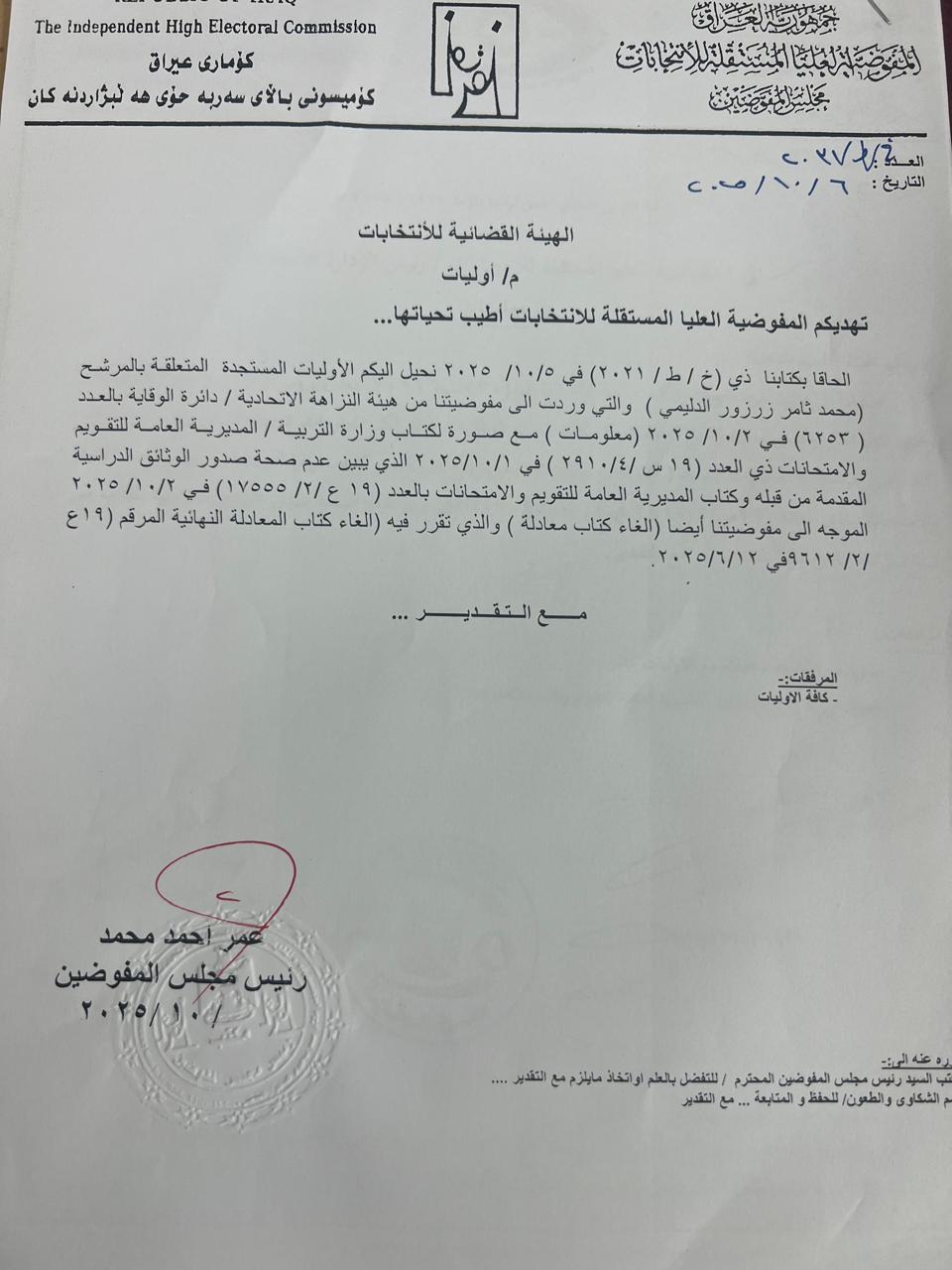 "الحاقا بكتابنا ذي (خ / ط / ۲۰۲۱ ) في 2025/۱۰/۵ نحيل اليكم الأوليات المستجدة المتعلقة بالمرشح محمد ثامر زرزور الدليمي ) والتي وردت الى مفوضيتنا من هيئة النزاهة الاتحادية / دائرة الوقاية بالعدد ( ٦٢٥٣ في ۲۰۲٥/١٠/٢ (معلومات ) مع صورة لكتاب وزارة التربية / المديرية العامة للتقويم والامتحانات ذي العدد (۱۹) س / ٤ / ۲۹۱۰ ) في ۲۰۲۵/۱۰/۱۸ الذي يبين عدم صحة صدور الوثائق الدراسية المقدمة من قبله وكتاب المديرية العامة للتقويم والامتحانات بالعدد ( ۱۹ ع / ۲ / (۱۷٥٥٥) في ٢٠٢٥/١٠/٢ الموجه الى مفوضيتنا أيضا الغاء) كتاب معادلة ( والذي تقرر فيه الغاء) كتاب المعادلة النهائية المرقم (۱۹ع /٩٦١٢/٢ في ٢٠٢٥/٦/١٢.
