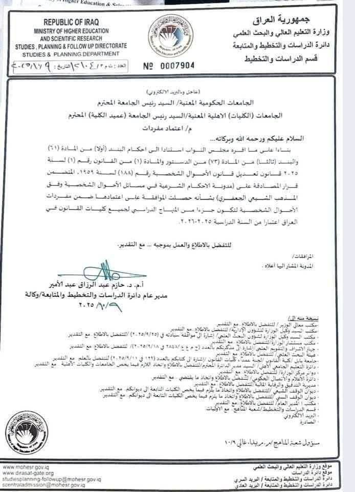 التعليم توجه باعتماد مدونة الأحكام الشرعية للفقه الجعفري في كليات القانون الحكومية والاهلية اعتبارا من الغام المقبل