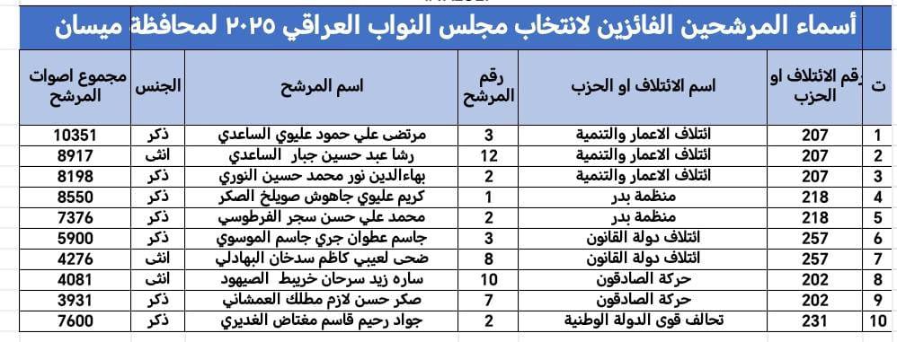 اسماء الفائزين في الانتخابات البرلمانية بمحافظة ميسان