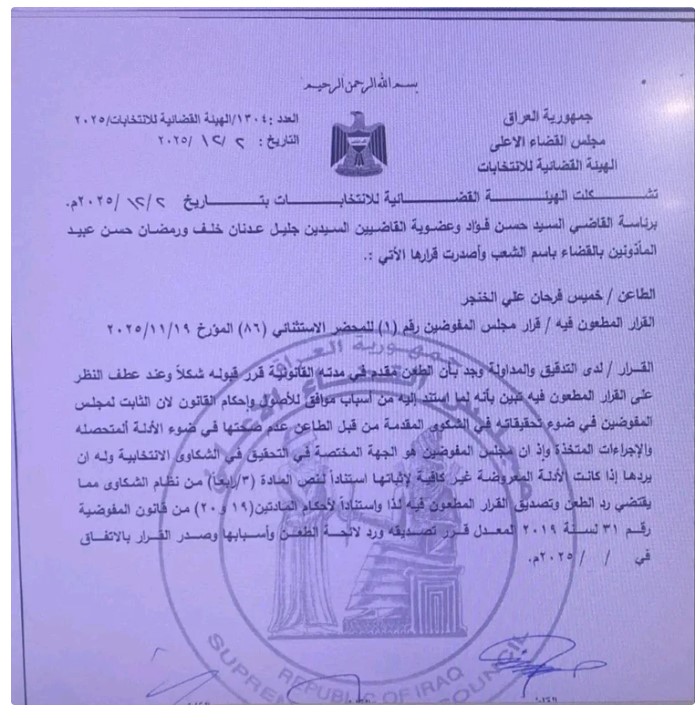 الهيئة القضائية تصادق على قرار المفوضية برد شكوى الخنجر ضد المرشح "أحمد شهيد"