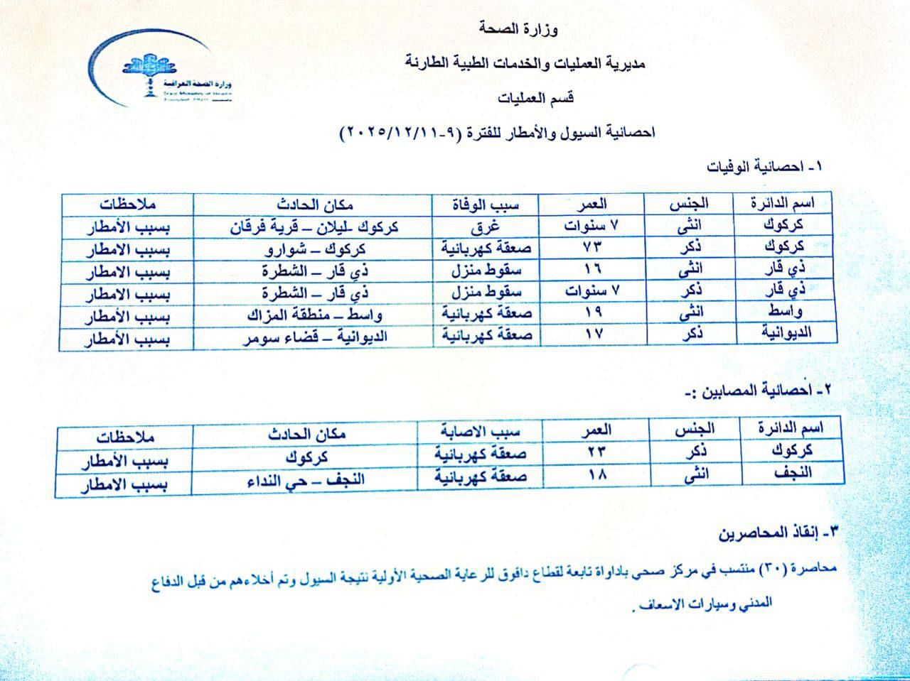 اعلنت وزارة الصحة عن وقوع 6 وفيات اصابتين بسبب الأمطار والسيول للفترة من 9 – 11 من الشهر الجاري في خمس محافظات.