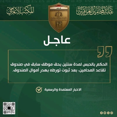كشفت نقابة المحامين العراقيين، اليوم الخميس ( 18 كانون الاول 2025 )، عن الحكم بالحبس لمدة سنتين بحق موظف سابق في صندوق تقاعد المحامين.