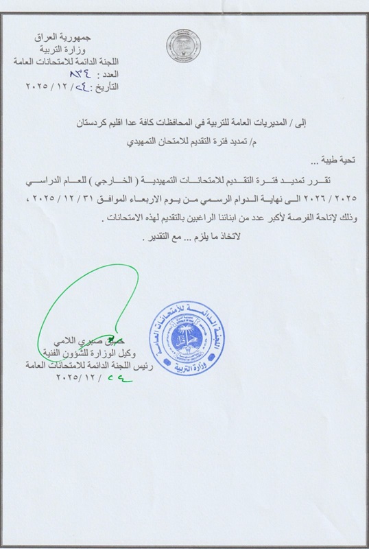 اعلنت وزارة التربية / المديرية العامة للتقويم والامتحانات، الموافقة عن تمديد فترة التقديم للامتحانات التمهيدية (الخارجي) ، الى نهاية الدوام الرسمي ليوم الاربعاء الموافق 31/12/2025.