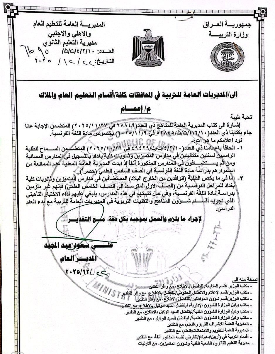 قررت المديرية العامة للتعليم العام والاهلي والاجنبي في وزارة التربية السماح للطلبة الراسبين لسنتين متتاليتين في مدارس المتميزين وثانويات كلية بغداد/ الصف السادس العلمي(حصرا) بمواصلة دراستهم لمادة اللغة الفرنسية ".
