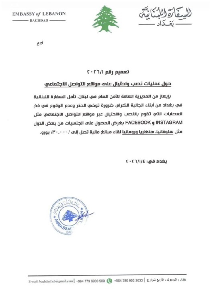 وذكرت السفارة في بيان، أنه "بإيعاز من المديرية العامة للأمن العام في لبنان، تأمل السفارة اللبنانية في بغداد من أبناء الجالية الكرام ضرورة توخي الحذر وعدم الوقوع في فخ العصابات التي تقوم بالنصب والاحتيال".