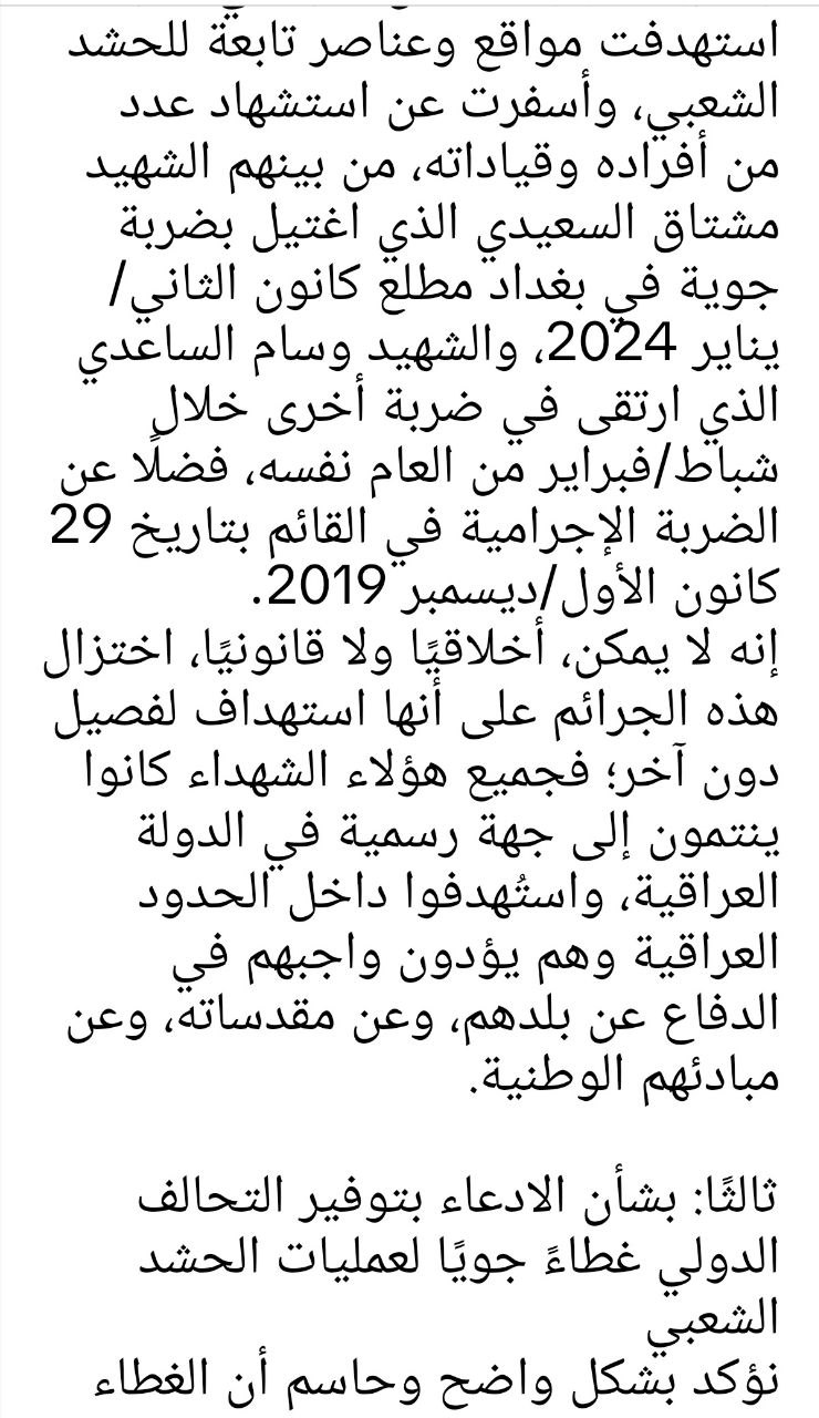 نؤكد أن استهداف نائب رئيس هيئة الحشد الشعبي واغتياله في بغداد، وهو مسؤول عسكري رسمي في الدولة العراقية ولا ينتمي إلى أي فصيل مسلح، يُعدّ انتهاكًا صارخًا لسيادة العراق، ويُثبت بما لا يدع مجالًا للشك أن العداء الأمريكي كان موجّهًا إلى الحشد الشعبي كمؤسسة وطنية، وليس إلى أطراف بعينها.