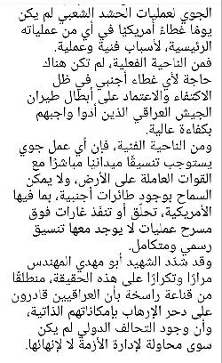 نؤكد بشكل واضح وحاسم أن الغطاء الجوي لعمليات الحشد الشعبي لم يكن يومًا غطاءً أمريكيًا في أي من عملياته الرئيسية، لأسباب فنية وعملية.