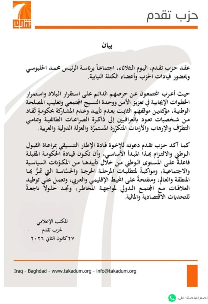أكد حزب تقدم، اليوم الثلاثاء، عدم تأييده ولا مشاركته بحكومة تقاد من شخصيات تعيد العراقيين لذاكرة "الصراعات الطائفية"