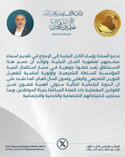 دعا النائب الأول لرئيس مجلس النواب عدنان فيحان الدليمي، اليوم الإثنين ( 2 شباط 2026 )، رؤساء الكتل النيابية للإسراع في تقديم مرشحيها في اللجان مؤكداً ان حسمها اولوية لتفعيل التشريع والرقابة وصون المال العام