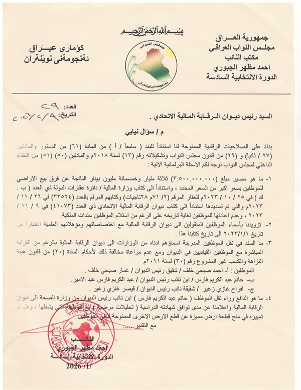 وجّه النائب أحمد مظهر الجبوري، سؤالاً نيابياً إلى رئيس ديوان الرقابة المالية الاتحادي، بشأن ما وصفه بملفات حساسة تتعلق بالمال العام وآليات نقل موظفين ومنح قطع أراضٍ داخل مؤسسة يفترض أنها الجهة العليا المعنية بحماية المال العام.
