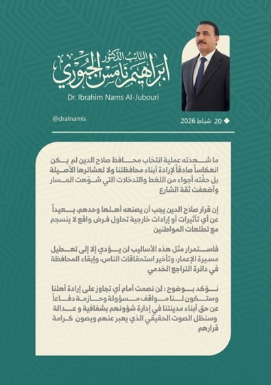 أكد النائب عن تحالف العزم، إبراهيم نامس الجبوري، اليوم الجمعة، ( 20 شباط 2026 )، أن ما شهدته عملية انتخاب محافظ صلاح الدين لم يكن انعكاساً صادقاً لإرادة أبناء المحافظة ولا لعشائرها.