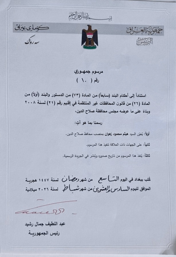 أصدر رئيس الجمهورية، عبد اللطيف جمال رشيد، المرسوم الجمهوري رقم (10) لسنة 2026، القاضي بتعيين هيثم محمود زهوان بمنصب محافظ صلاح الدين.