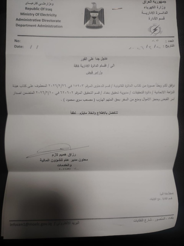 واشارت وثيقة صادرة من وزارة الكهرباء بتاريخ ( 2 آذار 2026 )، الى "صدور أمر بإلقاء القبض وحجز الاموال ومنع السفر بحق رئيس الجمعية التعاونية لإسكان موظفي وزارة الكهرباء مصعب سري محمود".