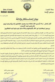 مجلس الامة الكويتي يستنكر الاعتداء التكفيري الذي استهدف منارتي العسكريين عليهما السلام