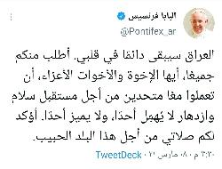 تغريدة جديدة للبابا فرنسيس بعد وصوله الفاتيكان : العراق سيبقى دائما في قلبي .. صلاتي من أجل هذا البلد الحبيب