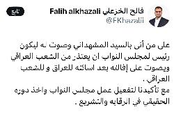 النائب فالح الخزعلي مغردًا : على من أتى بالسيد المشهداني وصوت له ليكون رئيس لمجلس النواب ان يعتذر من الشعب العراقي