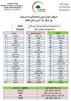 الموقف الوبائي اليومي لجائحة كورونا في العراق لليوم.