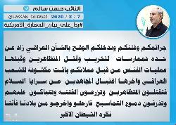 النائب حسن سالم يلمح لوقوف أمريكا وراء مقتل قياديين بسرايا السلام مؤخراً وقتل المتظاهرين