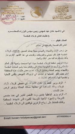 أهالي كربلاء يوجهون رسالة إلى عبد المهدي تتضمن مطلبين