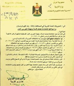 وزارة التربية تحدد مواعيد امتحانات نصف السنة والكورس الاول لجميع المراحل